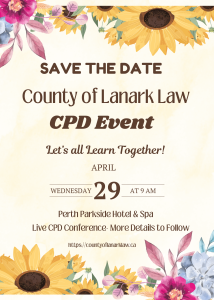 Let’s all learn together at our Spring CPD event!! Many areas of law will be covered during this event by guest speakers! Lunch will be provided and is included in the cost.